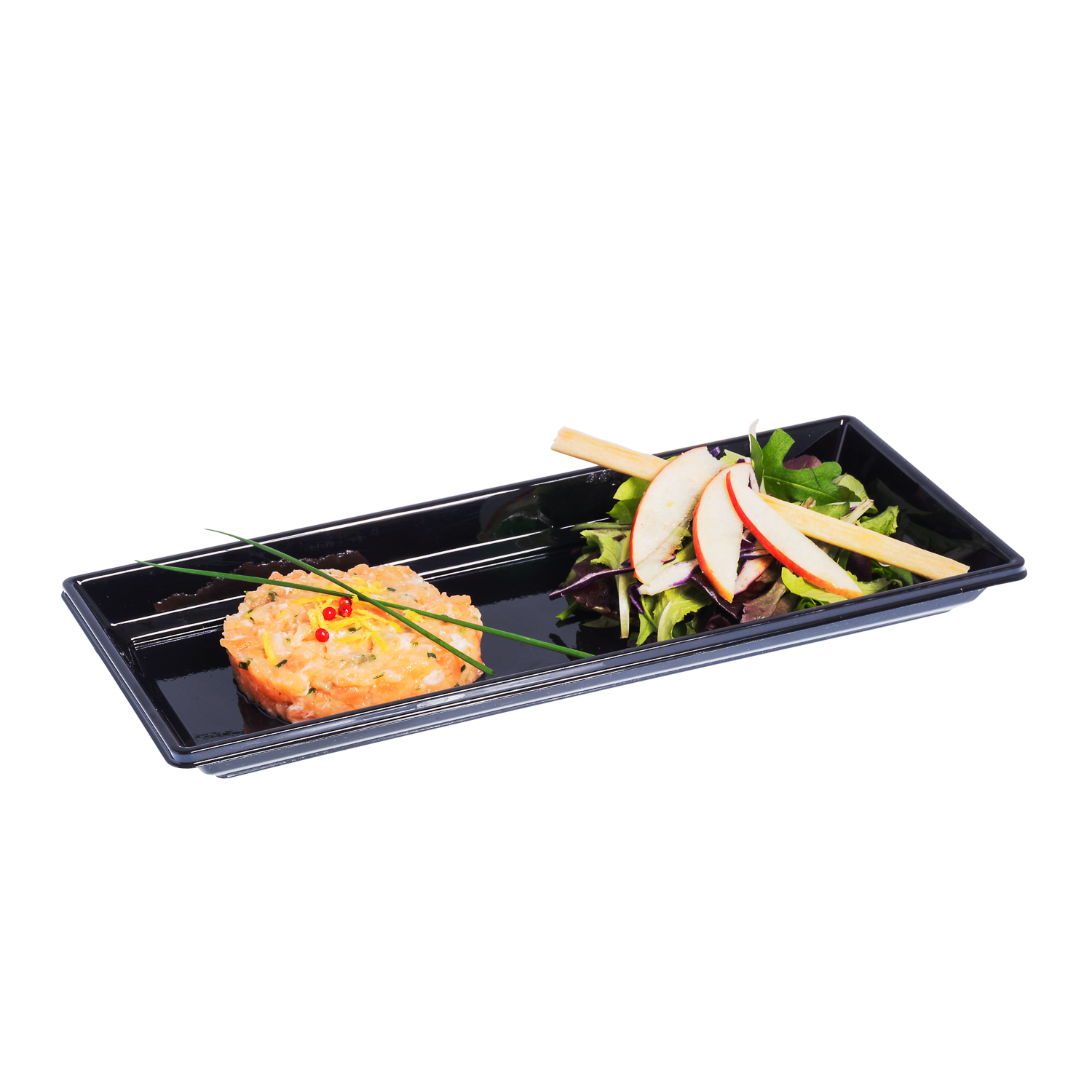 Cette longue assiette jetable en plastique entièrement recyclable sera idéale pour des présentations aérées mais aussi pour vos dressage de salades. Sont fond noir brillant fera ressortir tout l'éclat de votre savoir faire pour vos prestations plateaux-repas ou vente en boutique.