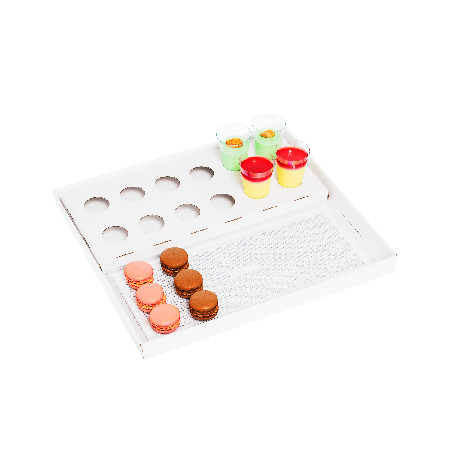 Cale verrines fabriqué en France et issu de matière recyclée entièrement recyclable. Cet indispensable pour le transport de vos verrines vous permet de proposer un coffret 24 verrines ou un coffret mixte verrines / pièces cocktail.