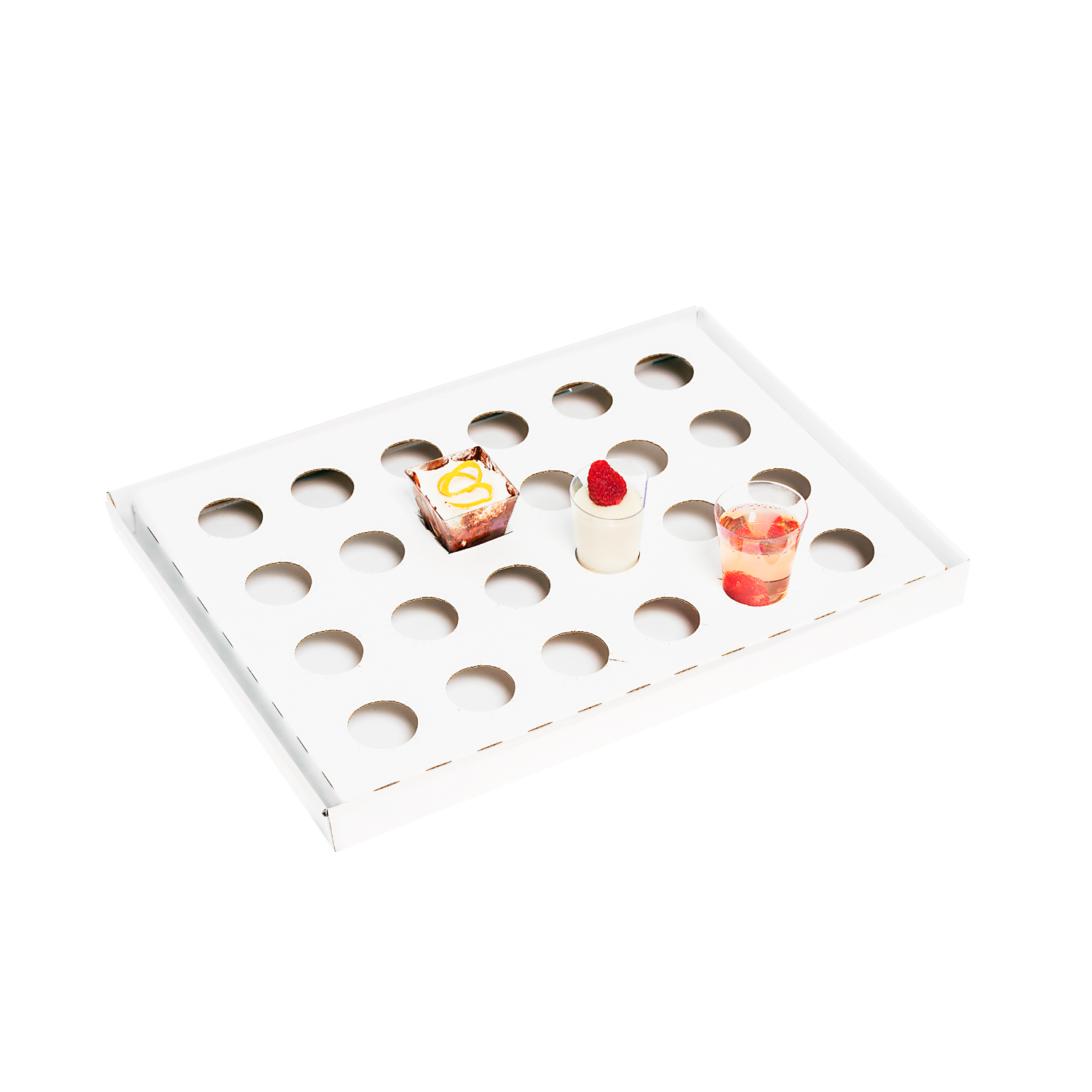 Cale verrines fabriqué en France et issu de matière recyclée entièrement recyclable. Cet indispensable pour le transport de vos verrines vous permet de proposer un coffret 24 verrines de forme différentes.