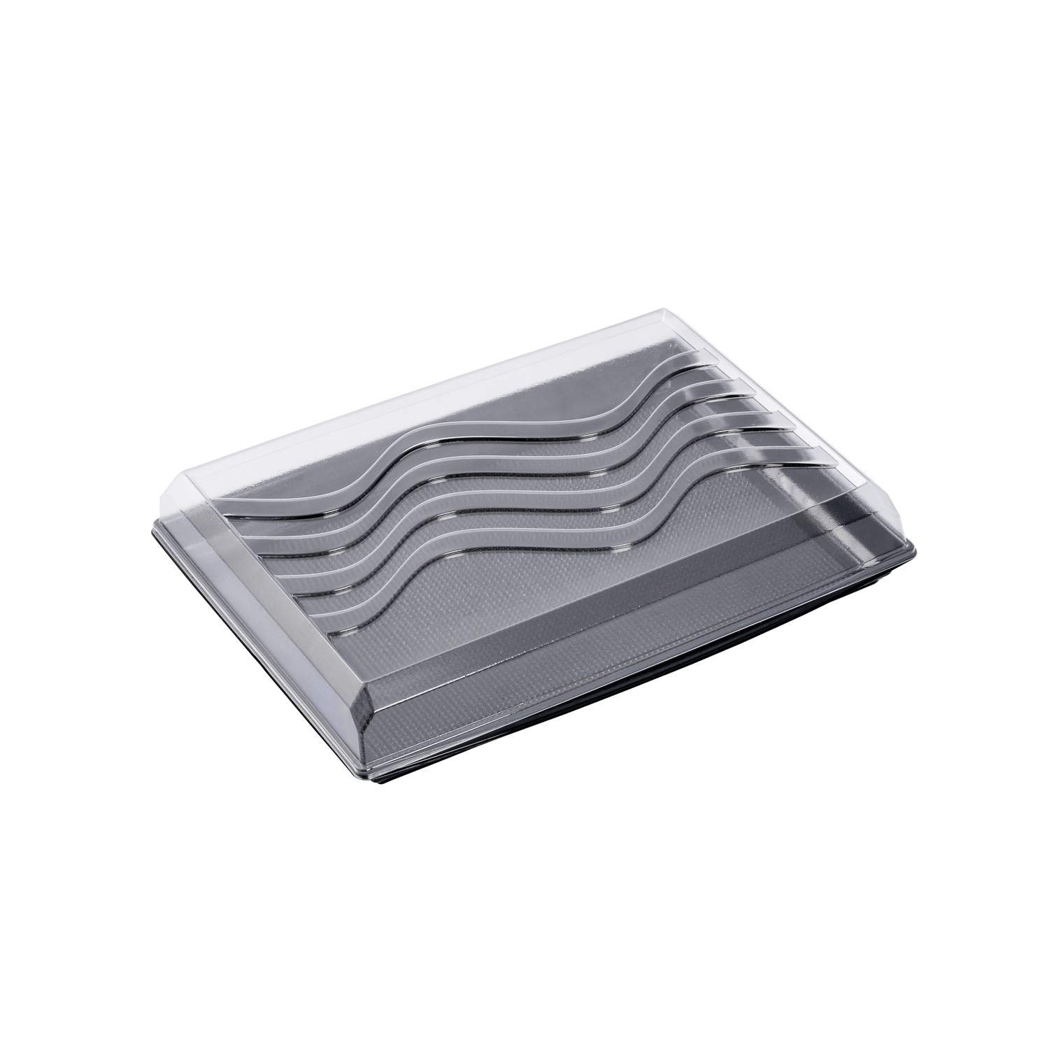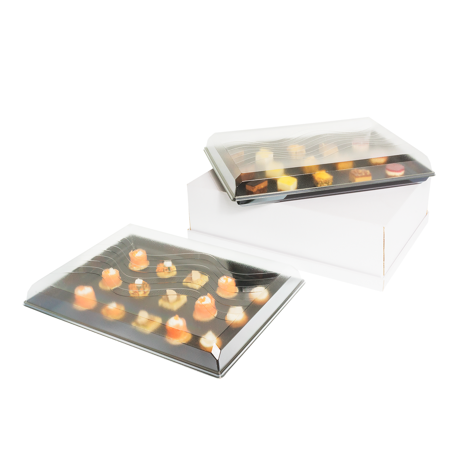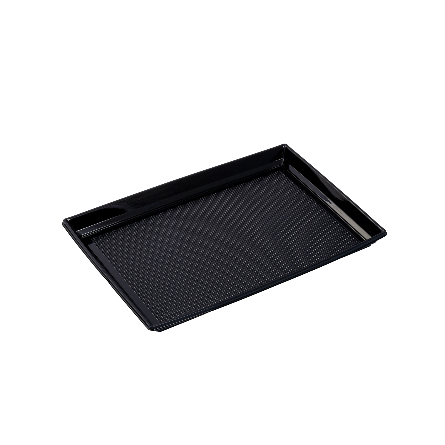 Son noir brillant mettra en valeur vos pièces cocktail ou mignardises et son fond en relief assurera un bon maintient pour un transport en toute sécurité.