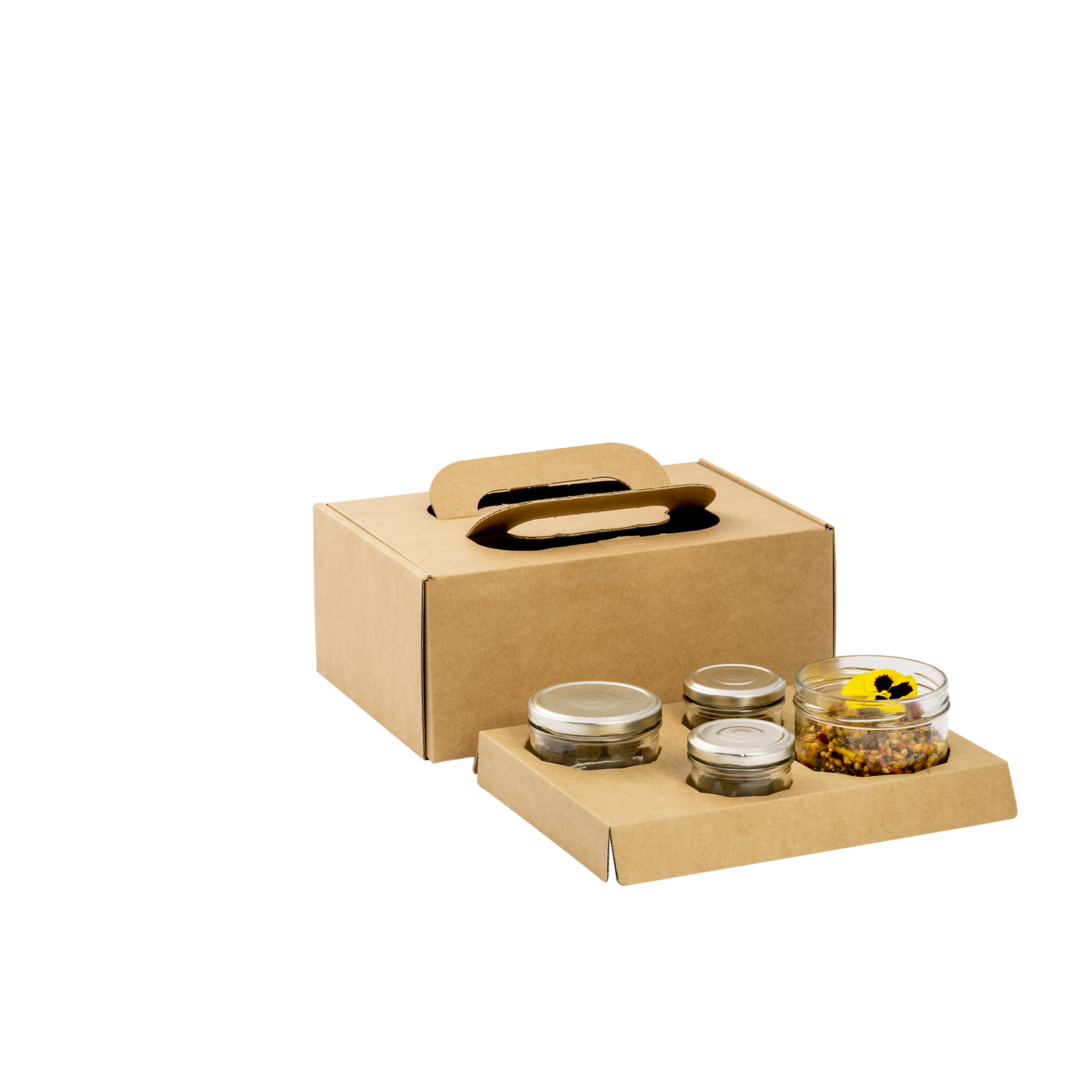 Boîte pour bocaux pratique et fonctionnelle, elle est personnalisable à partir de 100 et fabriquée en France. Composée principalement de matière recyclée elle est entièrement recyclable.