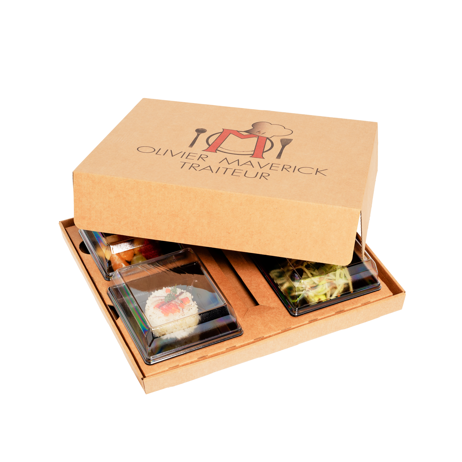 Ce coffret repas modulable et personnalisable, mettra en valeur votre savoir-faire pour vos prestations plateaux-repas en livraison. Son visuel aéré fait de lui un coffret de taille assez grande qui sera un avantage si vous l'utilisez pour du cocktail.